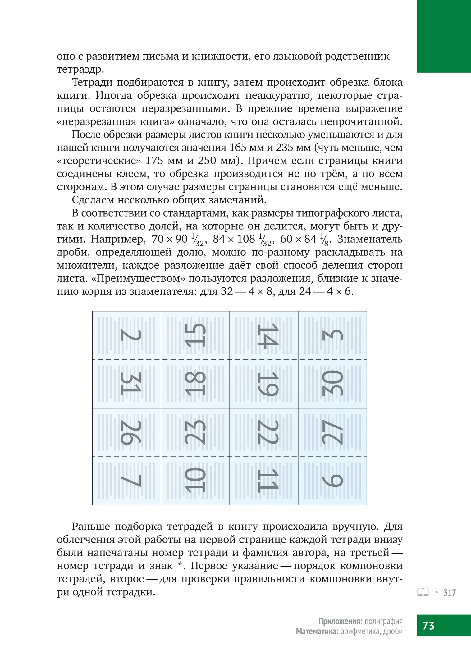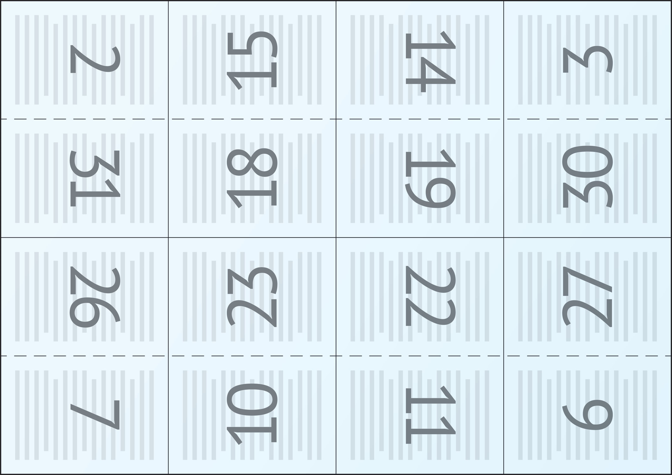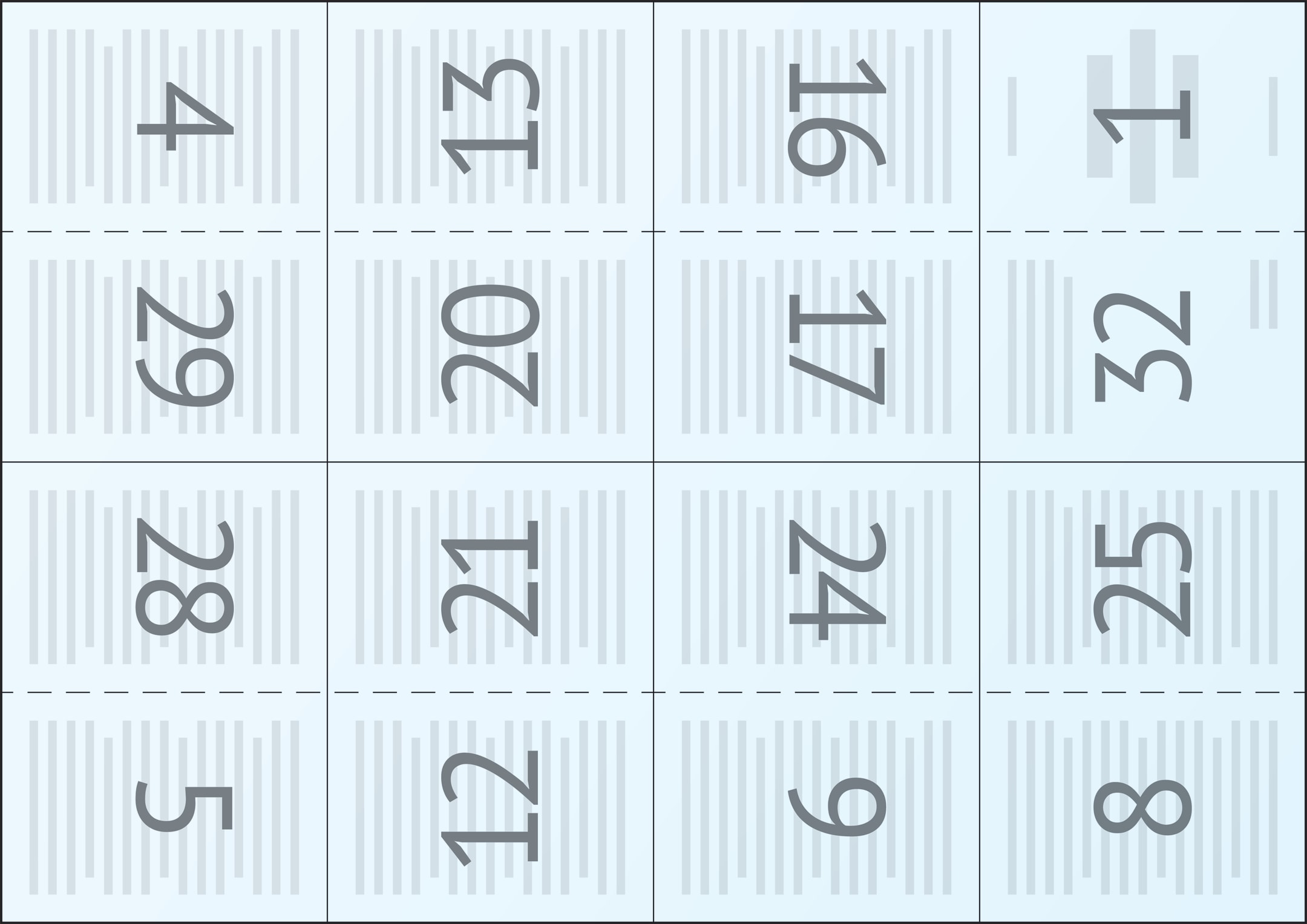 С каждой из двух сторон лист делится на 16 частей, каждая «ячейка» — будущая страница книги. После печати лист складывается несколько раз и превращается в тетрадь из 32 страниц.