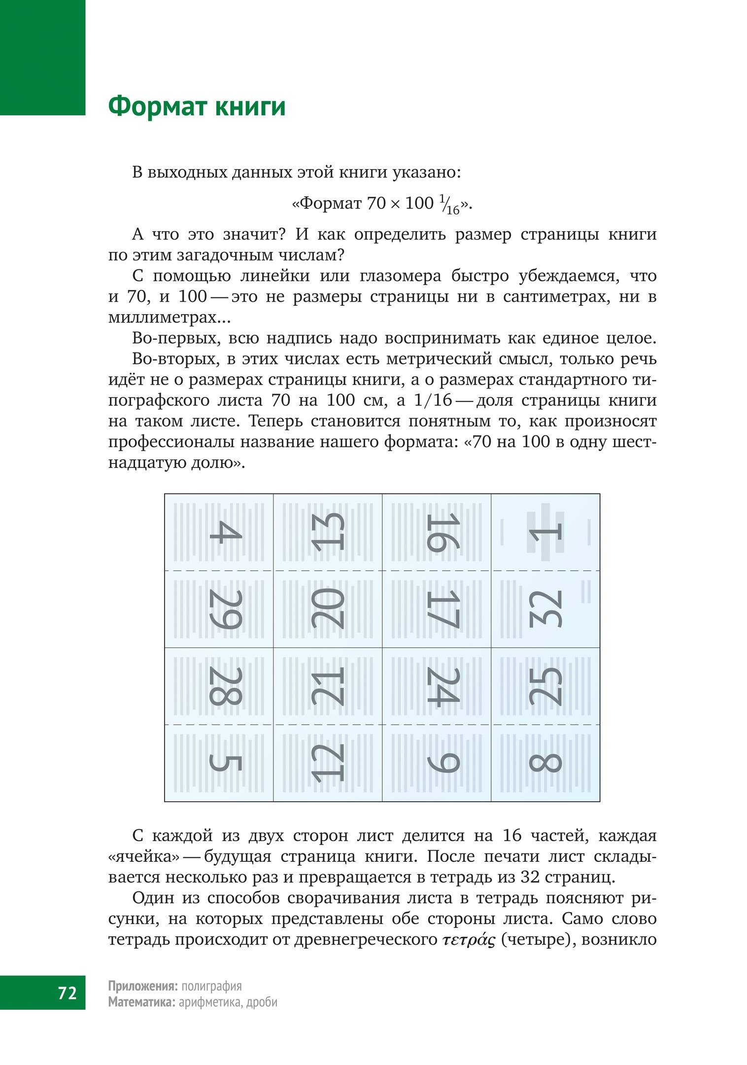 Во‐вторых, в этих числах есть метрический смысл, только речь идёт не о размерах страницы книги, а о размерах стандартного типографского листа 70 на 100 см, а $1/16$ — доля страницы книги на таком листе. Теперь становится понятным то, как произносят профессионалы название нашего формата: «70 на 100 в одну шестнадцатую долю».