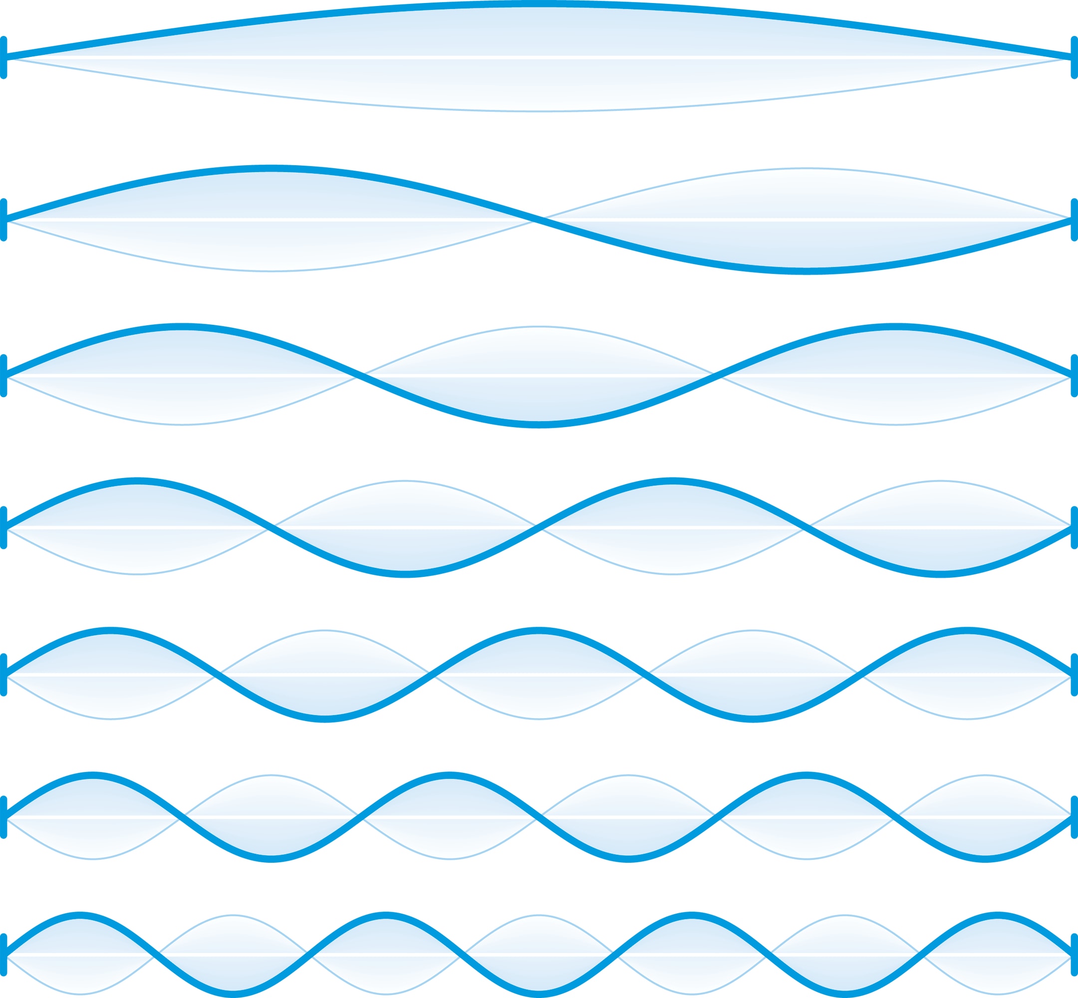 Основной тон (определяемый значением $f$ — основной частотой струны) представляет стоячую волну без узлов, неподвижны только концы струны.