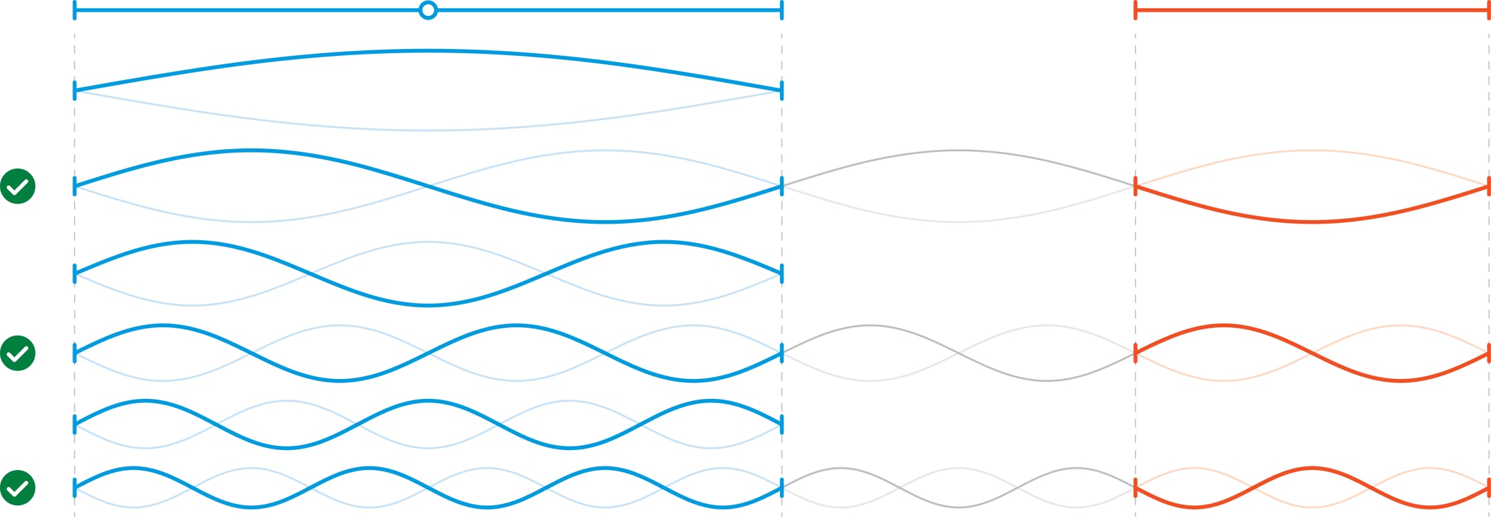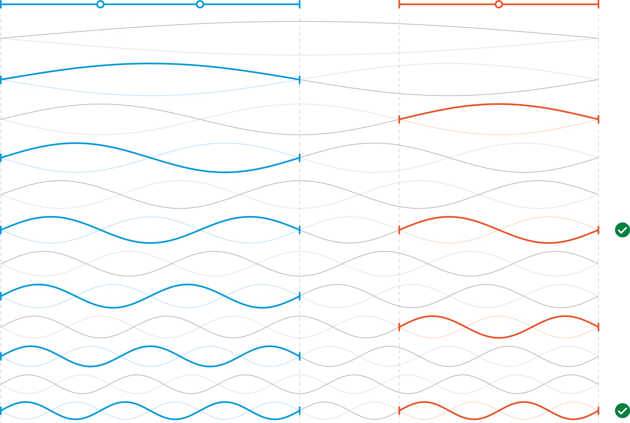 Наблюдаемые колебания струны с закреплёнными концами можно представить как результат наложения так называемых стоячих волн с незакреплёнными, но неподвижными точками (узлами) и однотипными колебаниями равных по длине участков между узлами.