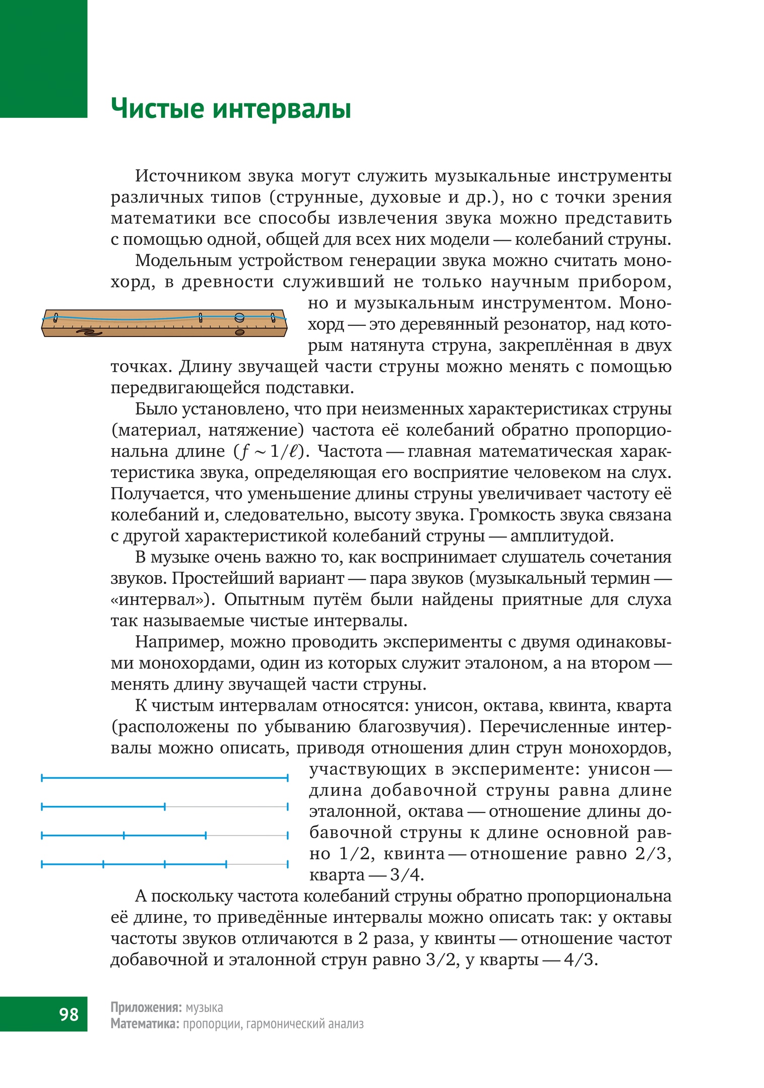 А поскольку частота колебаний струны обратно пропорциональна её длине, то приведённые интервалы можно описать так: у октавы частоты звуков отличаются в 2 раза, у квинты — отношение частот добавочной и эталонной струн равно 3/2, у кварты — 4/3.