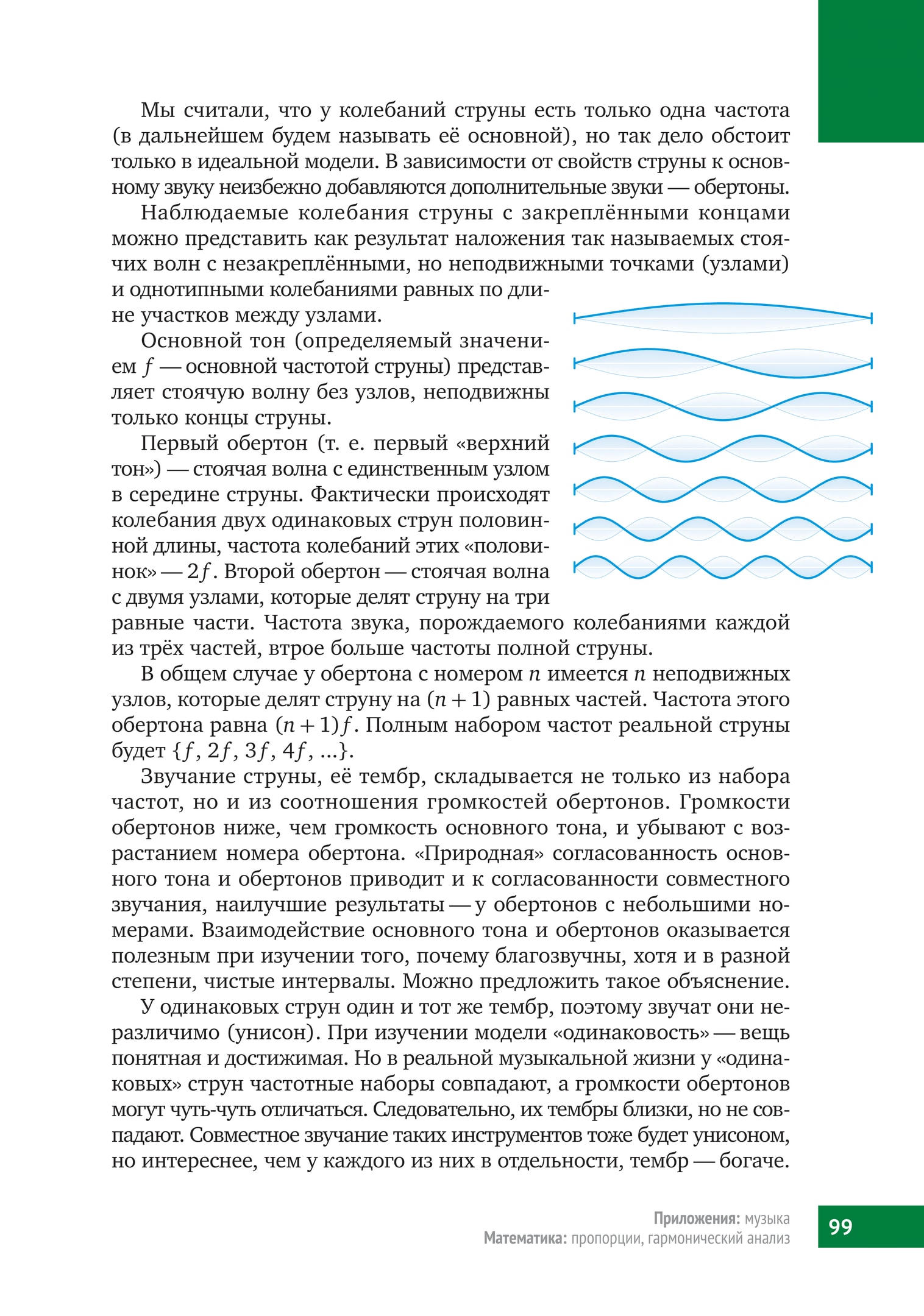 Описание звука струны как композиции основного тона и обертонов математически означает представление периодической функции суммой гармоник $\sin nx$, $\cos nx$. Эта сумма может быть «внешне» совсем непохожей на гармоники-составляющие. Из простых по звучанию тонов складывается богатый, выразительный тембр звука.