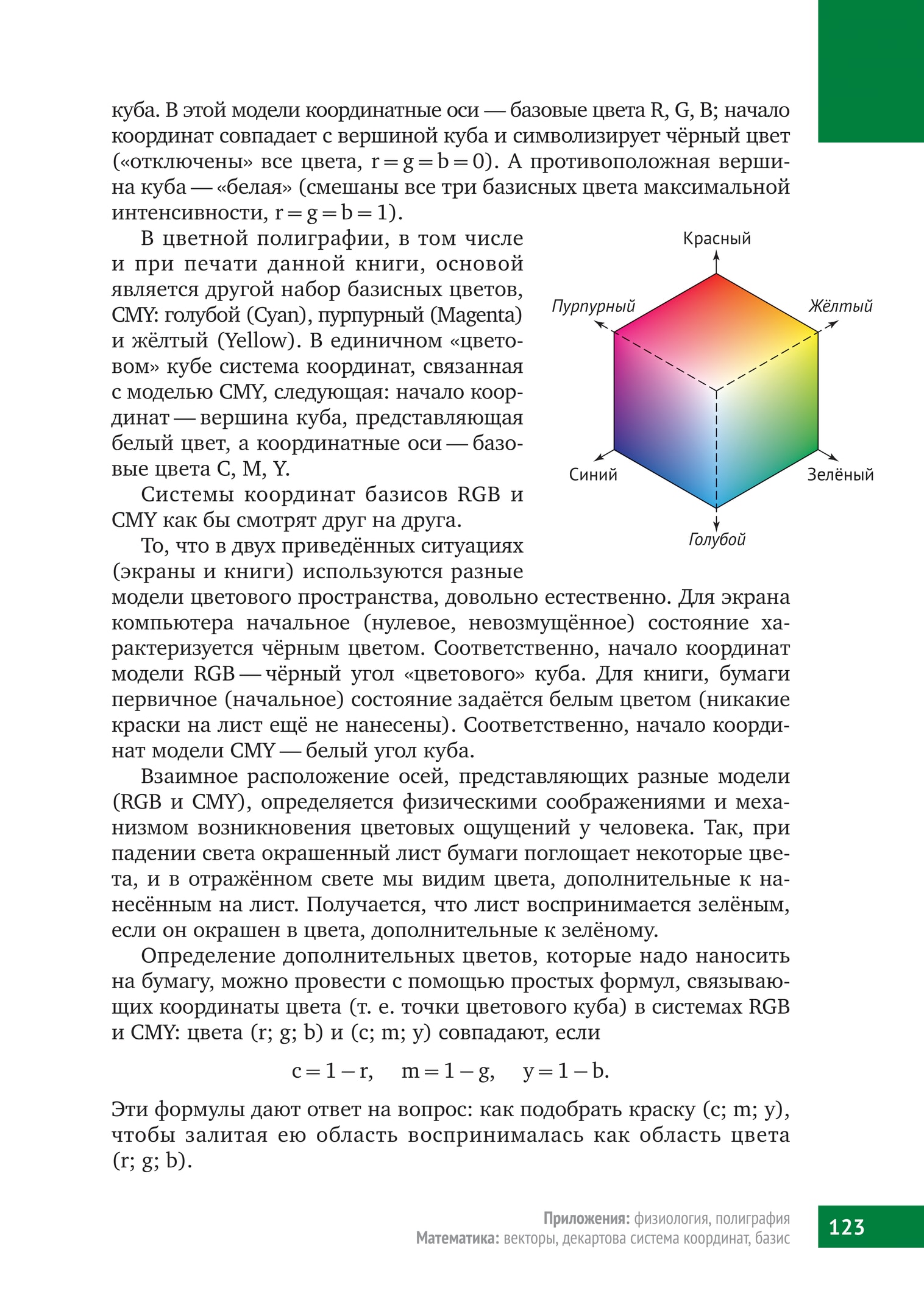 В цвет­ной полиграфии, в том числе и при печати дан­ной книги, осно­вой явля­ется дру­гой набор базис­ных цве­тов, CMY: голу­бой (Cyan), пурпур­ный (Magenta) и жёл­тый (Yellow). В еди­нич­ном «цве­то­вом» кубе система коор­ди­нат, свя­зан­ная с моде­лью CMY, сле­дующая: начало коор­ди­нат — вершина куба, пред­став­ляющая белый цвет, а коор­ди­нат­ные оси — базо­вые цвета C, M, Y.