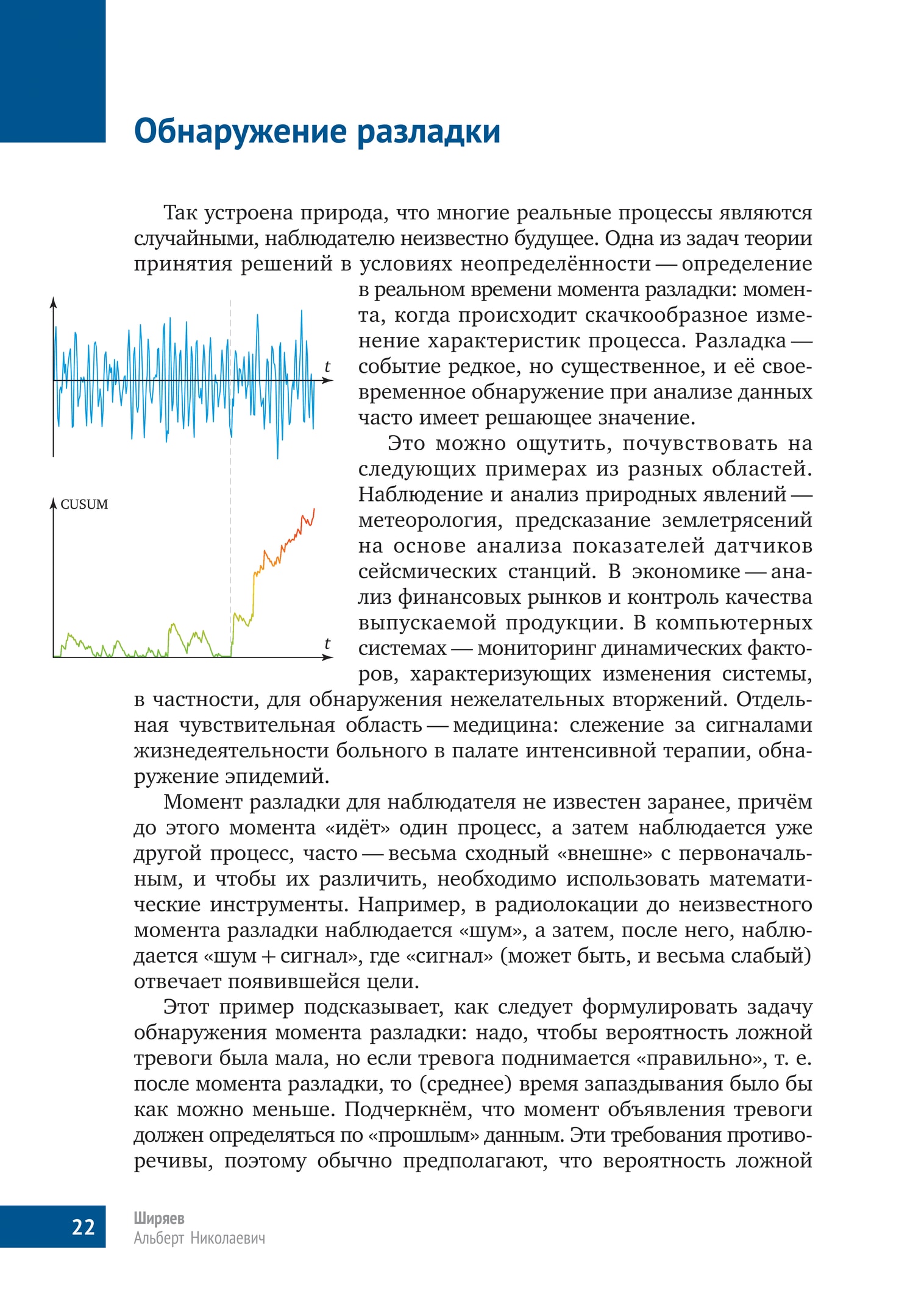 Так устроена природа, что многие реальные процессы являются случайными, наблюдателю неизвестно будущее. Oдна из задач теории принятия решений в условиях неопределённости — определение в реальном времени момента разладки: момента, когда происходит скачкообразное изменение характеристик процесса. Разладка — событие редкое, но существенное, и её своевременное обнаружение при анализе данных часто имеет решающее значение.