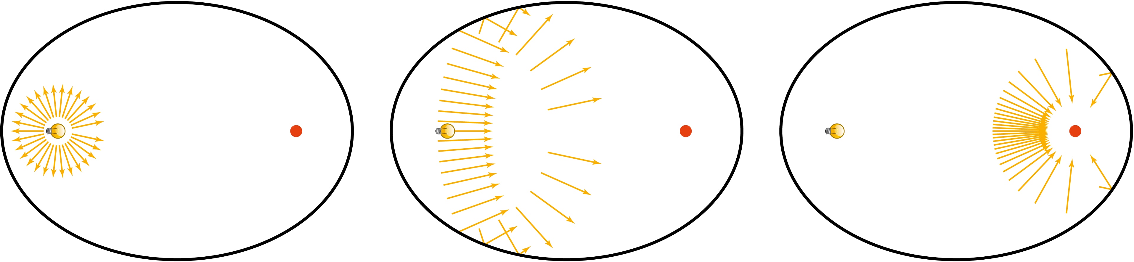 Вышедший из фокуса луч, достигнув эллипса, отражается по закону «угол падения равен углу отражения» (отражение от кривой — это отражение от касательной к кривой в этой точке).