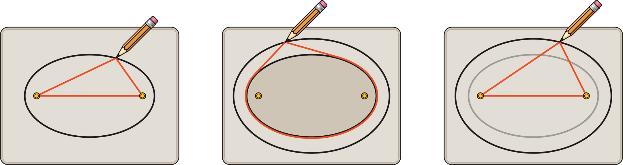 Нарисовав эллипс, изготовим его «физическую» копию из достаточно толстого материала, а затем совместим копию с оригиналом. Возьмём нитяную петлю, которой можно охватить эллипс, и, оттянув её карандашом, проведём овальную линию. Оказывается, это тоже эллипс, причём софокусный исходному. Утверждение можно проверить экспериментально, подобрав длину петли, охватывающей фокусы.