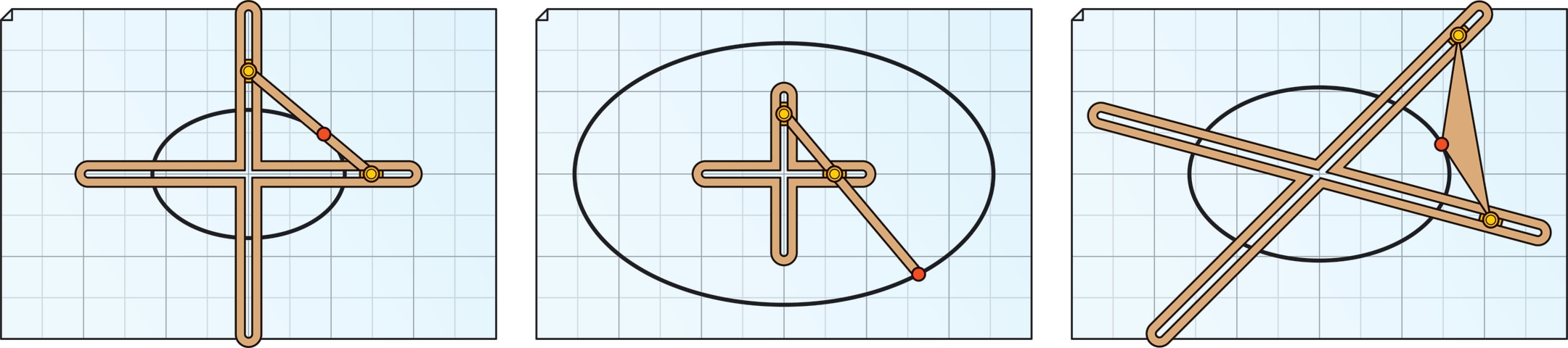 Более редкая идея. Две вершины треугольника скользят по двум пересекающимся прямым (не обязательно перпендикулярным) — траектория третьей вершины будет эллипсом.