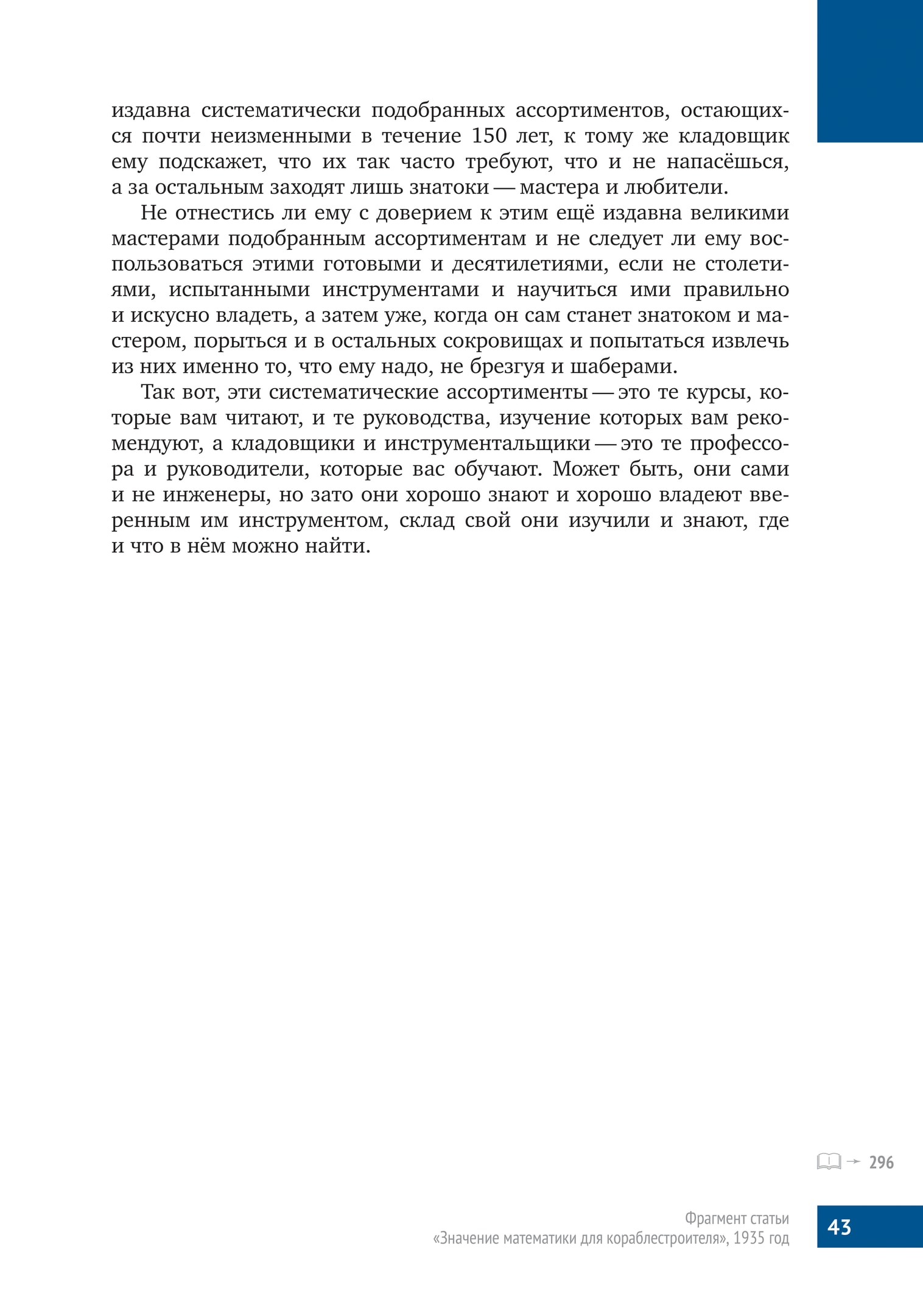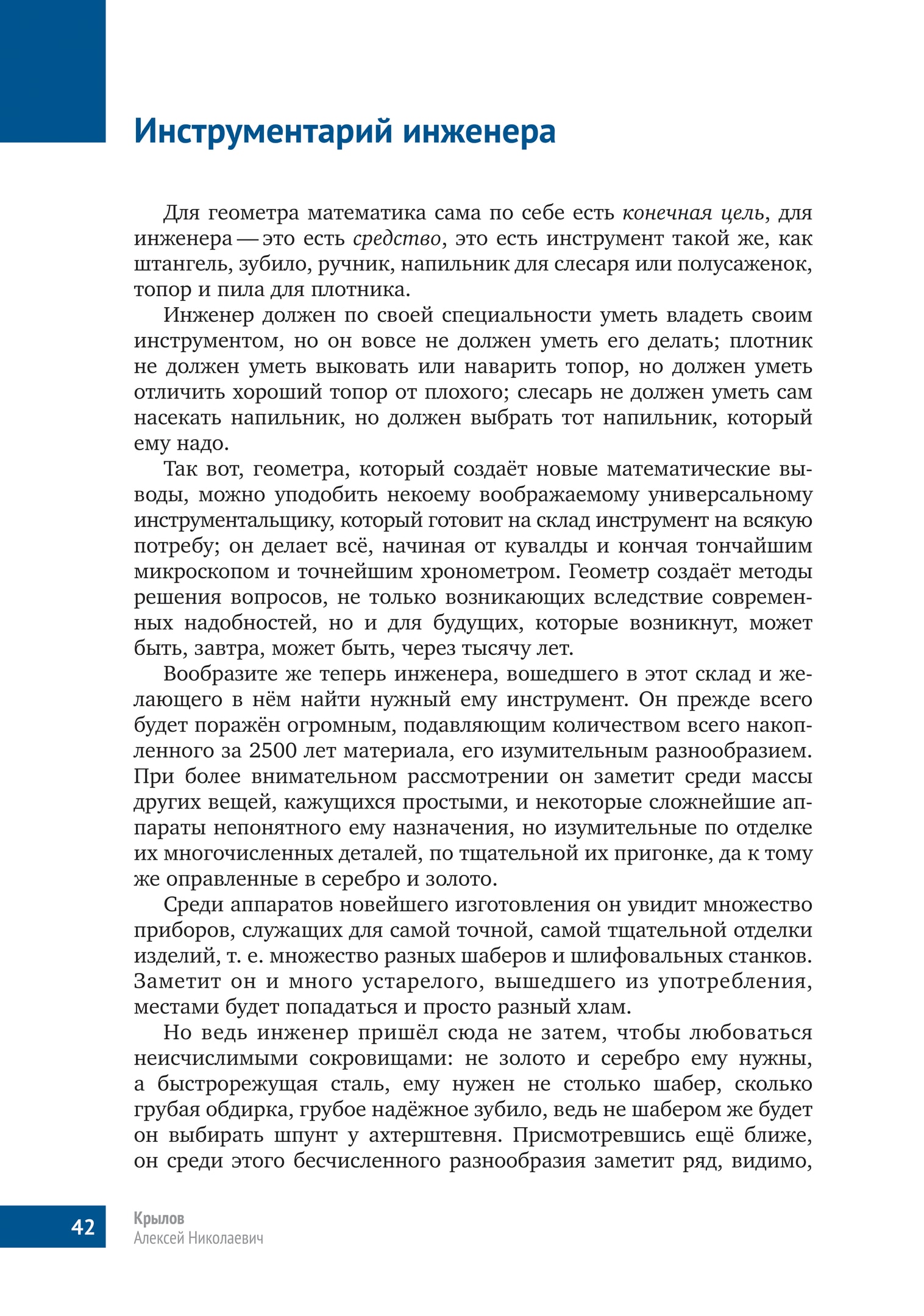 Инженер должен по своей специальности уметь владеть своим инструментом, но он вовсе не должен уметь его делать; плотник не должен уметь выковать или наварить топор, но должен уметь отличить хороший топор от плохого; слесарь не должен уметь сам насекать напильник, но должен выбрать тот напильник, который ему надо.