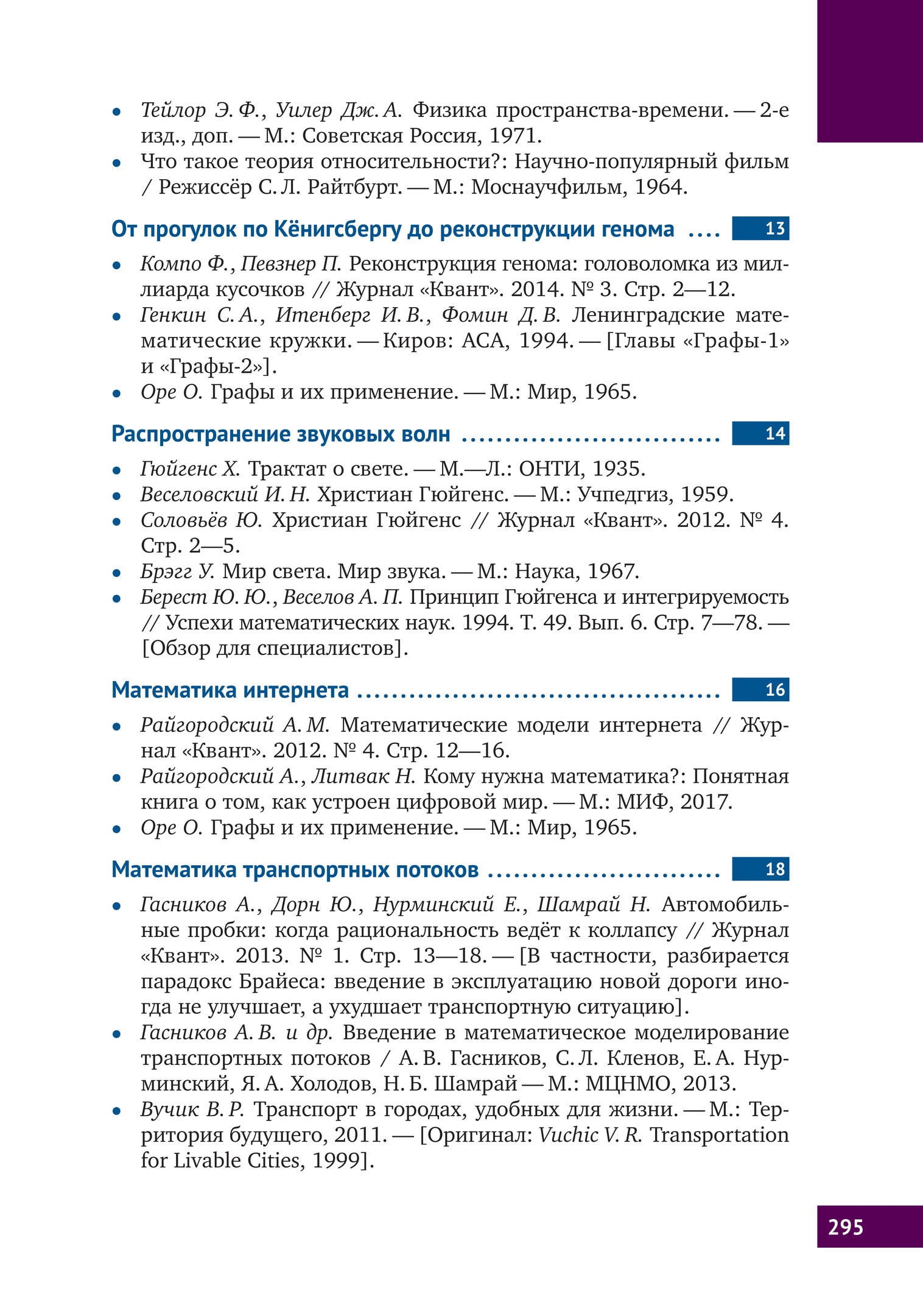 Дополнением к сюжету служит и небольшой список книг, с помощью которого читатель сможет расширить и уточнить свои представления о предмете статьи. В списке книги по возможности упорядочены: от простого к более сложному, от непосредственно связанных с сюжетом к более далёким. Уровень трудности книг почти всегда соответствует уровню занятий школьного математического кружка.