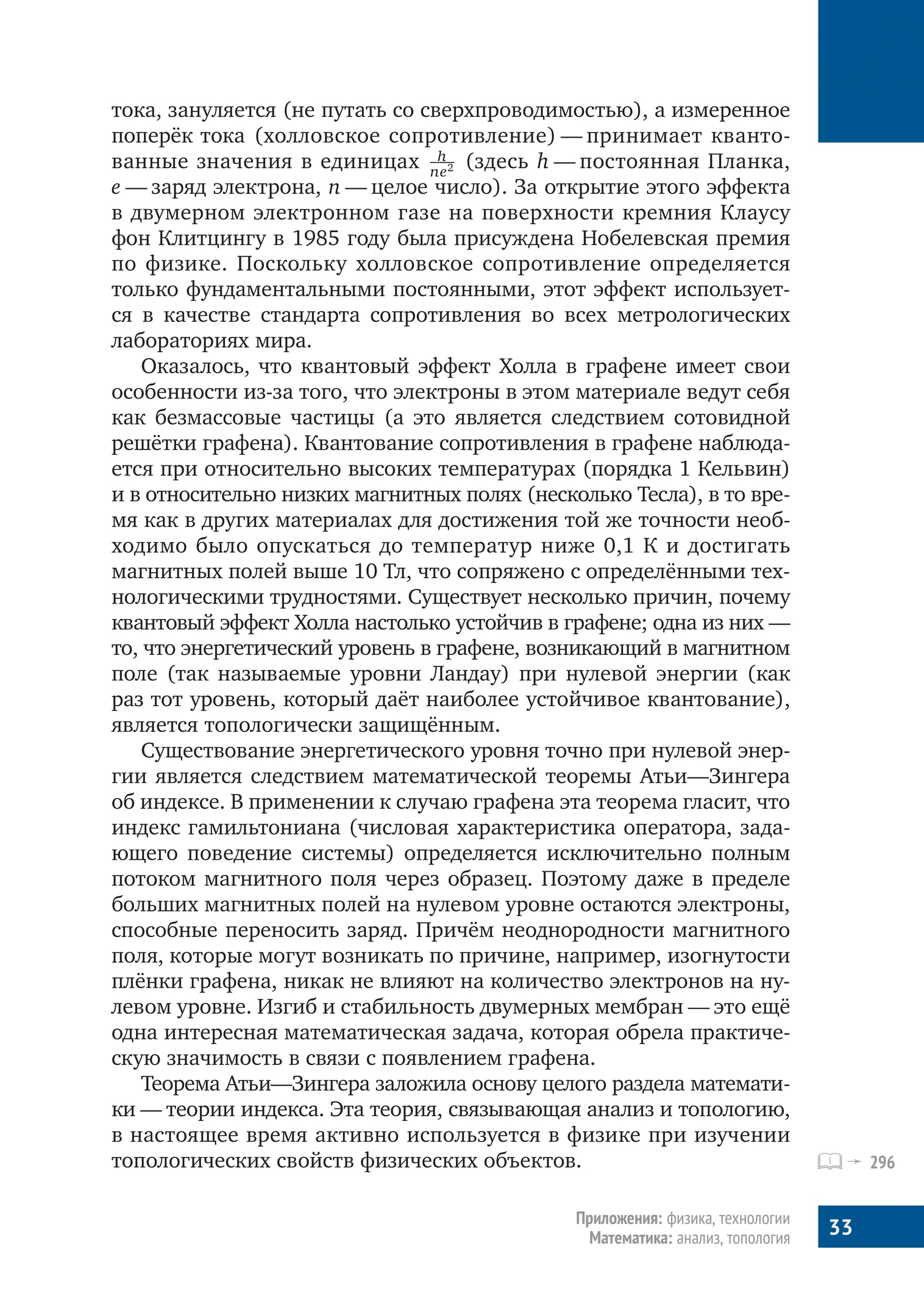 Существование энергетического уровня точно при нулевой энергии является следствием математической теоремы Атьи—Зингера об индексе. В применении к случаю графена эта теорема гласит, что индекс гамильтониана (числовая характеристика оператора, задающего поведение системы) определяется исключительно полным потоком магнитного поля через образец. Поэтому даже в пределе больших магнитных полей на нулевом уровне остаются электроны способные переносить заряд. Причём неоднородности магнитного поля, которые могут возникать по причине, например, изогнутости плёнки графена, никак не влияют на количество электронов на нулевом уровне. Изгиб и стабильность двумерных мембран — это ещё одна интересная математическая задача, которая обрела практическую значимость в связи с появлением графена.