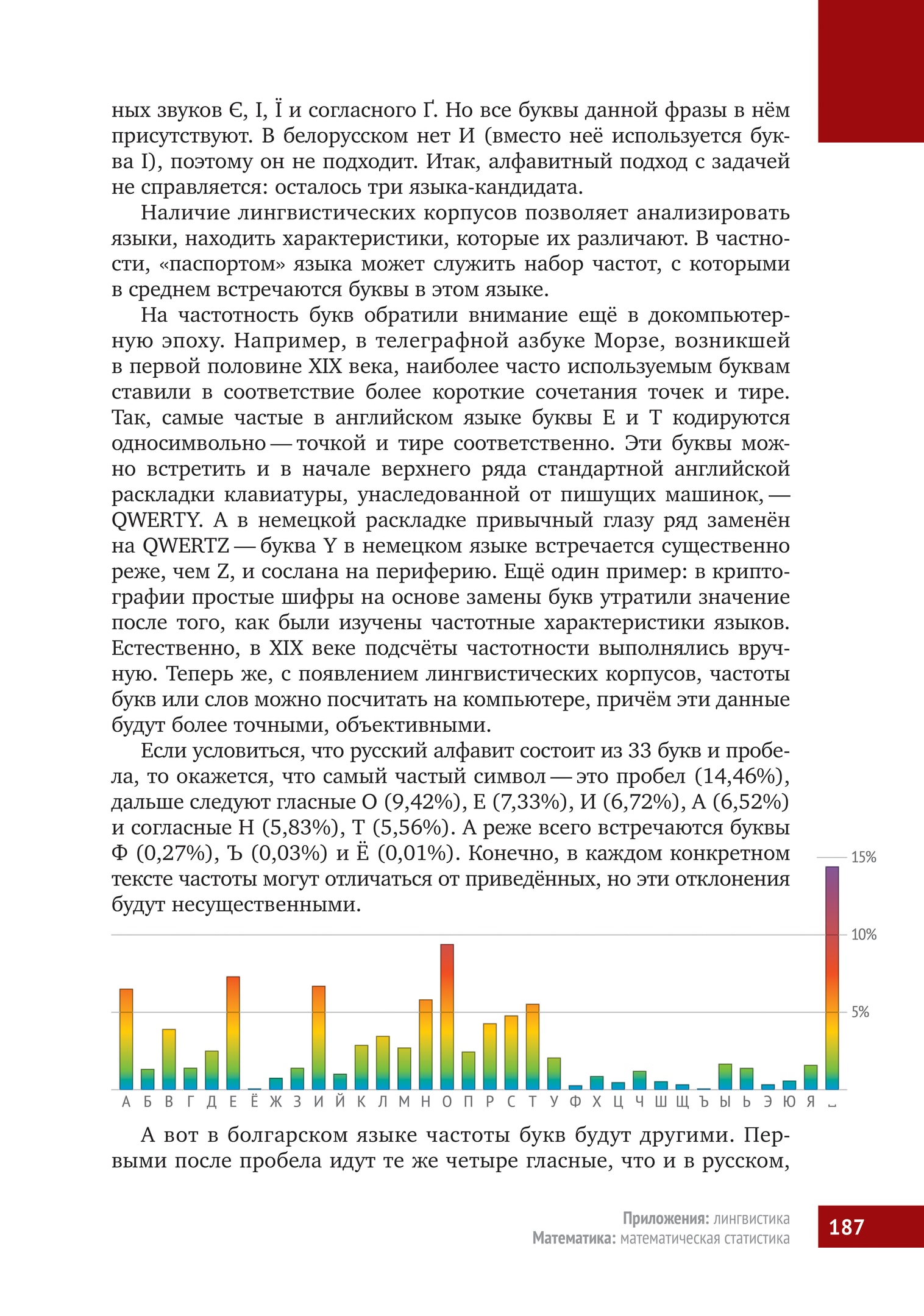 Рас­смот­рим две задачи — авто­ма­ти­че­ское опре­де­ле­ние языка тек­ста и исправ­ле­ние опе­ча­ток, хорошие реше­ния кото­рых осно­ваны на ана­лизе частот­но­сти отдель­ных букв и слов, а также их соче­та­ний в реаль­ных текстах. Уди­ви­тельно, но такой под­ход поз­во­ляет решать эти задачи, не обла­дая зна­ни­ями ни о грамма­ти­че­ских пра­ви­лах язы­ков, ни о смыс­лах ана­ли­зи­ру­емых тек­стов.