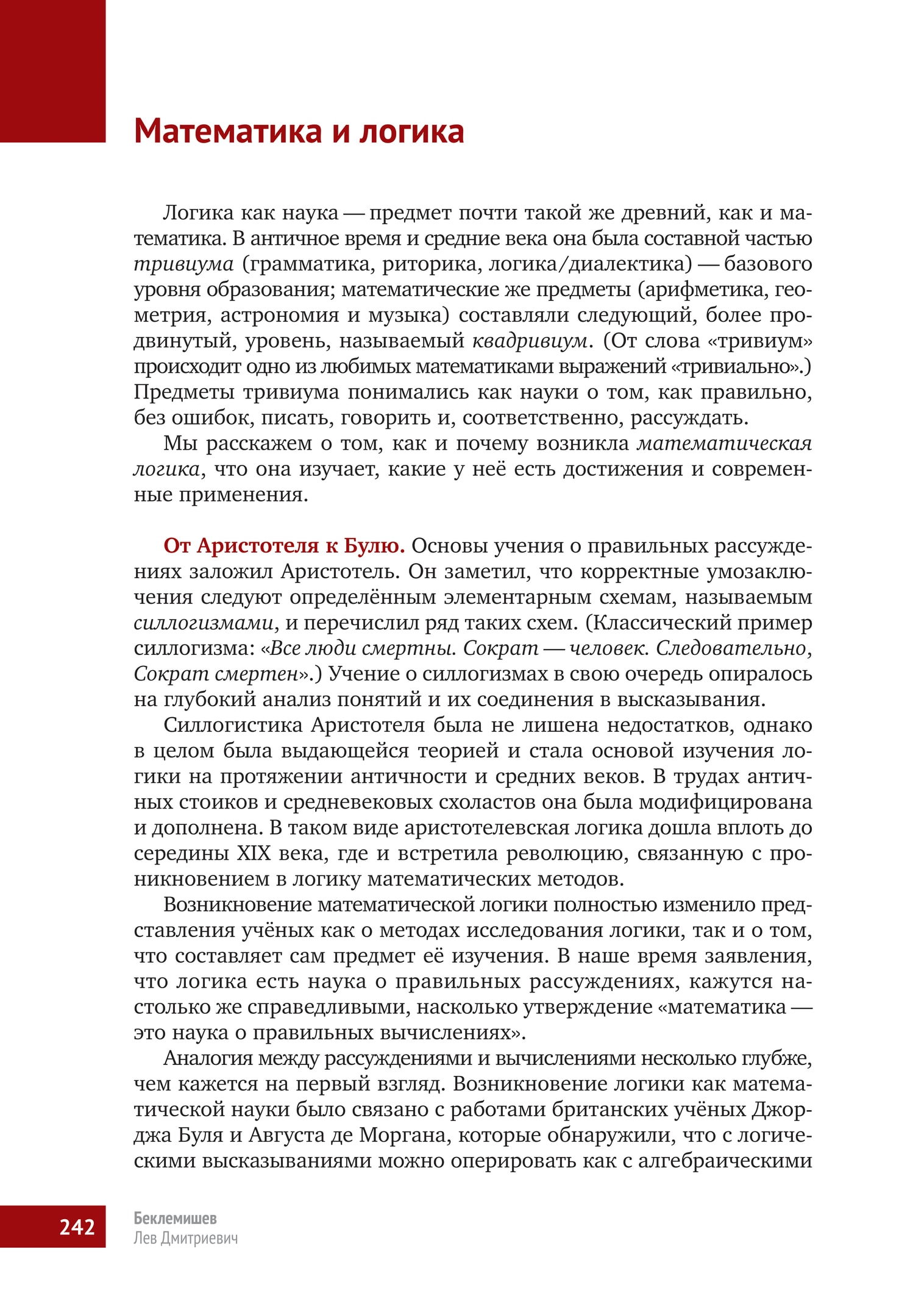 Логика как наука — предмет почти такой же древний, как и математика. В античное время и средние века она была составной частью тривиума (грамматика, риторика, логика/диалектика) — базового уровня образования; математические же предметы (арифметика, геометрия, астрономия и музыка) составляли следующий, более продвинутый, уровень, называемый квадривиум. (От слова «тривиум» происходит одно из любимых математиками выражений «тривиально».) Предметы тривиума понимались как науки о том, как правильно, без ошибок, писать, говорить и, соответственно, рассуждать.
