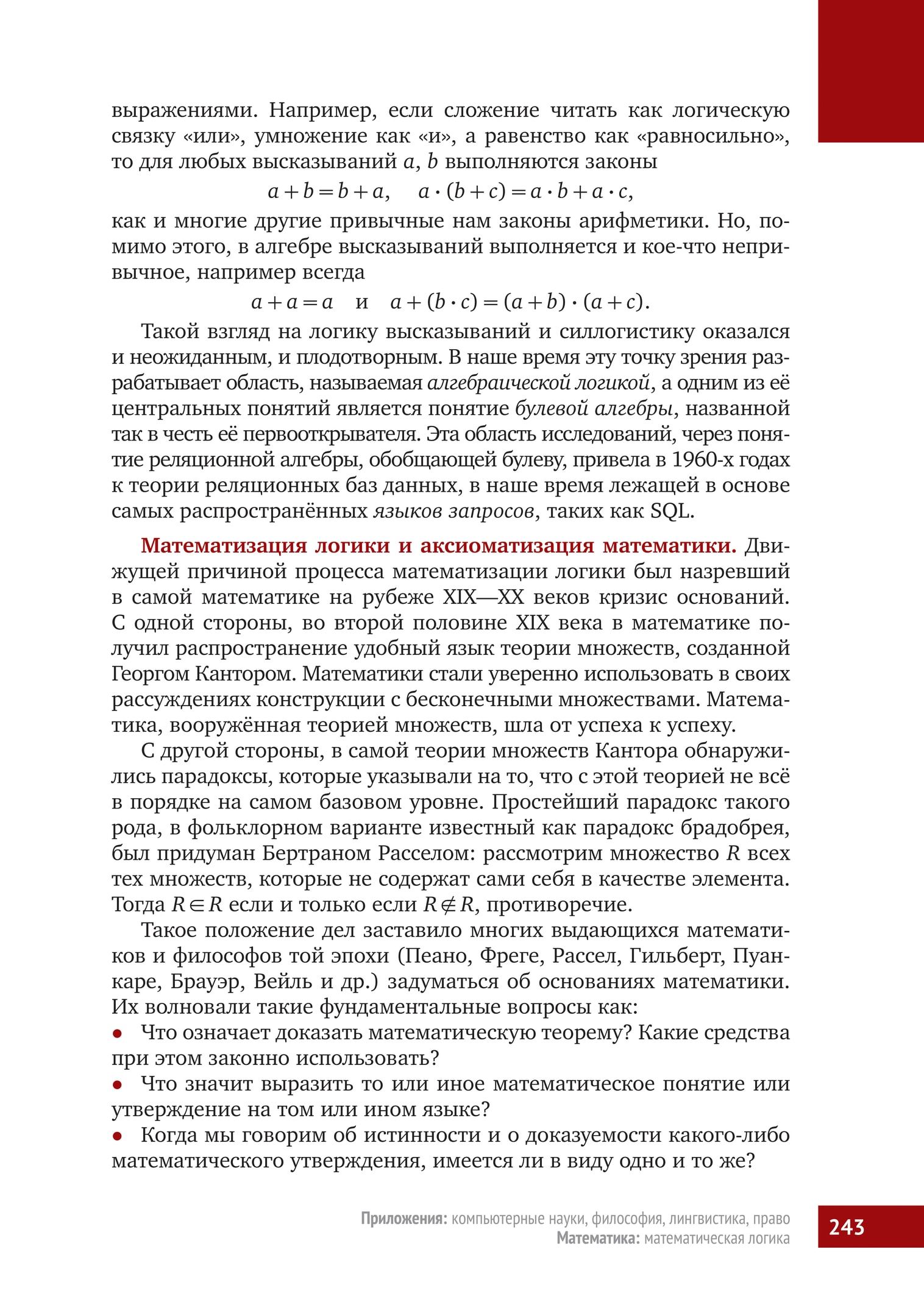 Неужели это всё математика? — недоумённо воскликнет читатель. И да, и нет. Исследователи, применяющие методы математической логики в той или иной области знания, должны прежде всего быть компетентными специалистами именно в этой области и разбираться в постановках специфических для неё задач. Напомним, что многие создатели математической логики — Гёдель, Тьюринг, фон Нейман и др. — не были только лишь «чистыми» математиками.