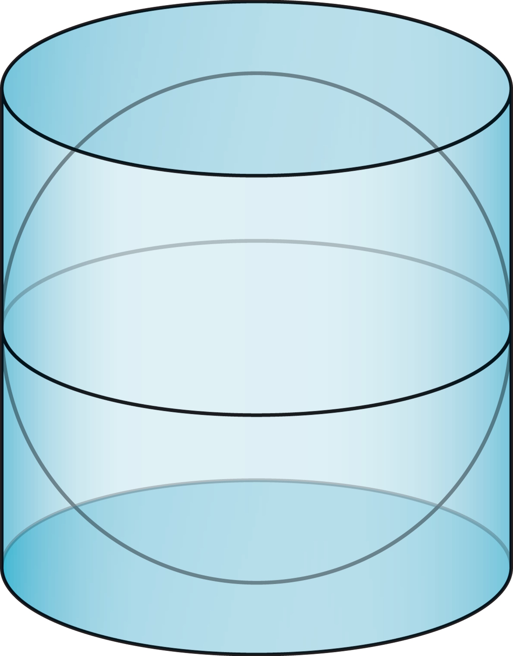 В каждом сечении плоскостью, параллельной основаниям фигур, площадь сечения цилиндра равна сумме площадей сечений конуса и «южной» половины шара. Из этого равенства площадей следует равенство объёмов (так называемый принцип Кавальери).