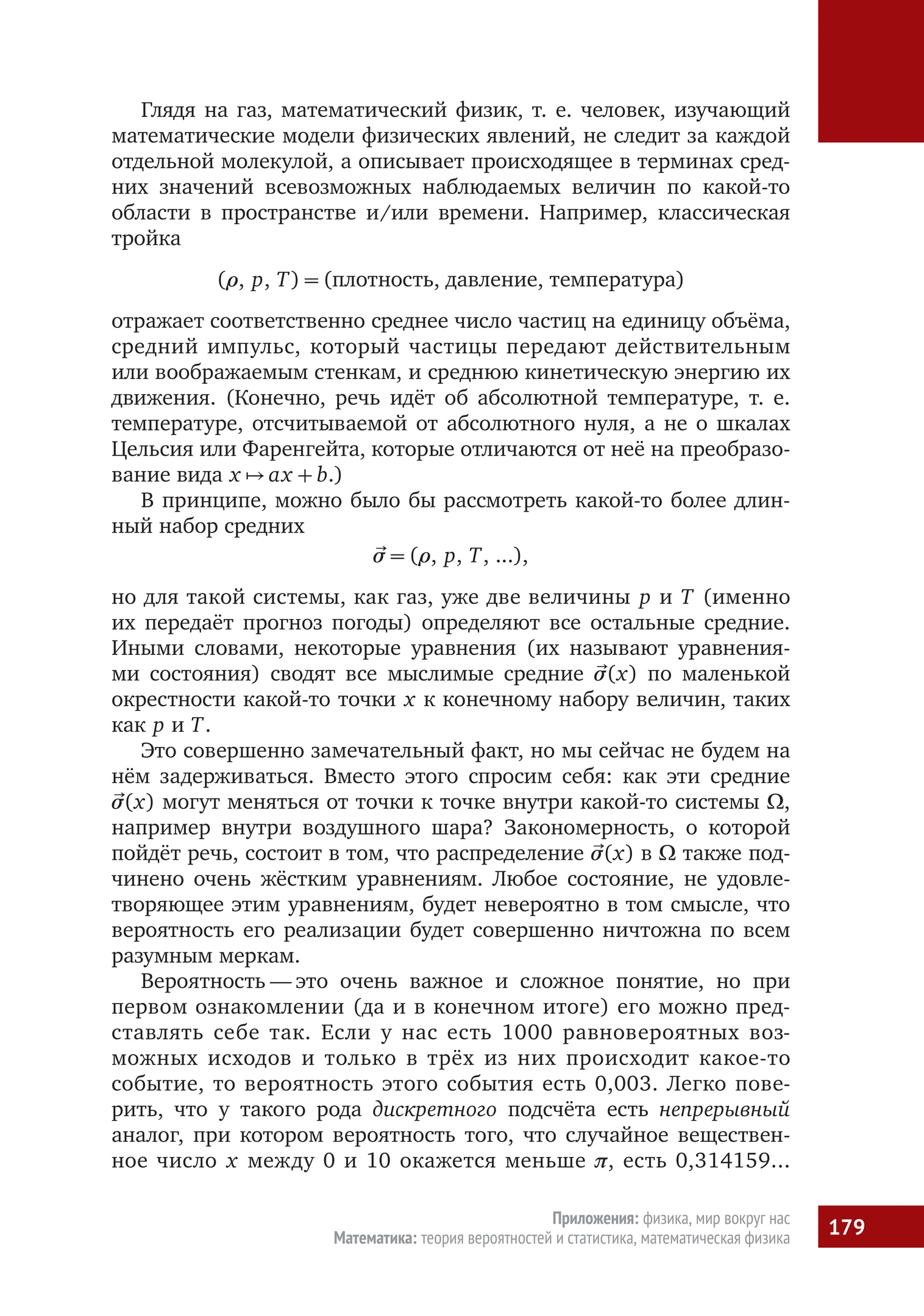 Вероятность — это очень важное и сложное понятие, но при первом ознакомлении (да и в конечном итоге) его можно представлять себе так. Если у нас есть 1000 равновероятных возможных исходов и только в трёх из них происходит какое-то событие, то вероятность этого события есть 0,003. Легко поверить, что у такого рода дискретного подсчёта есть непрерывный аналог, при котором вероятность того, что случайное вещественное число $х$ между 0 и 10 окажется меньше $π$, есть 0,314159… Всё непрерывное можно сколь угодно хорошо приблизить дискретным, и если отрезок от 0 до 10 разделить на миллион равных частей, то непрерывное событие $\{ x < π \}$ можно приблизить событием $\left\{ x \le \frac{314159}{100000}\right\}$. Для понимания сути обсуждаемых нами явлений разница между дискретным и непрерывным не существенна. Будем считать, что координаты и все другие параметры, описывающие движение молекул, округляются с точностью до какого-то очень маленького числа $\varepsilon$ и поэтому принимают какое-то гигантское, но конечное число возможных значений. В частности, на некоторой очень малой шкале, сравнимой с $\varepsilon$, мы можем наблюдать только конечное число состояний. Кстати, совсем необязательно предполагать, что все эти элементарные состояния равновероятны, просто надо считать их вклад в вероятность с соответствующими весами. Ни одно из последующих рассуждений от этого не изменится.