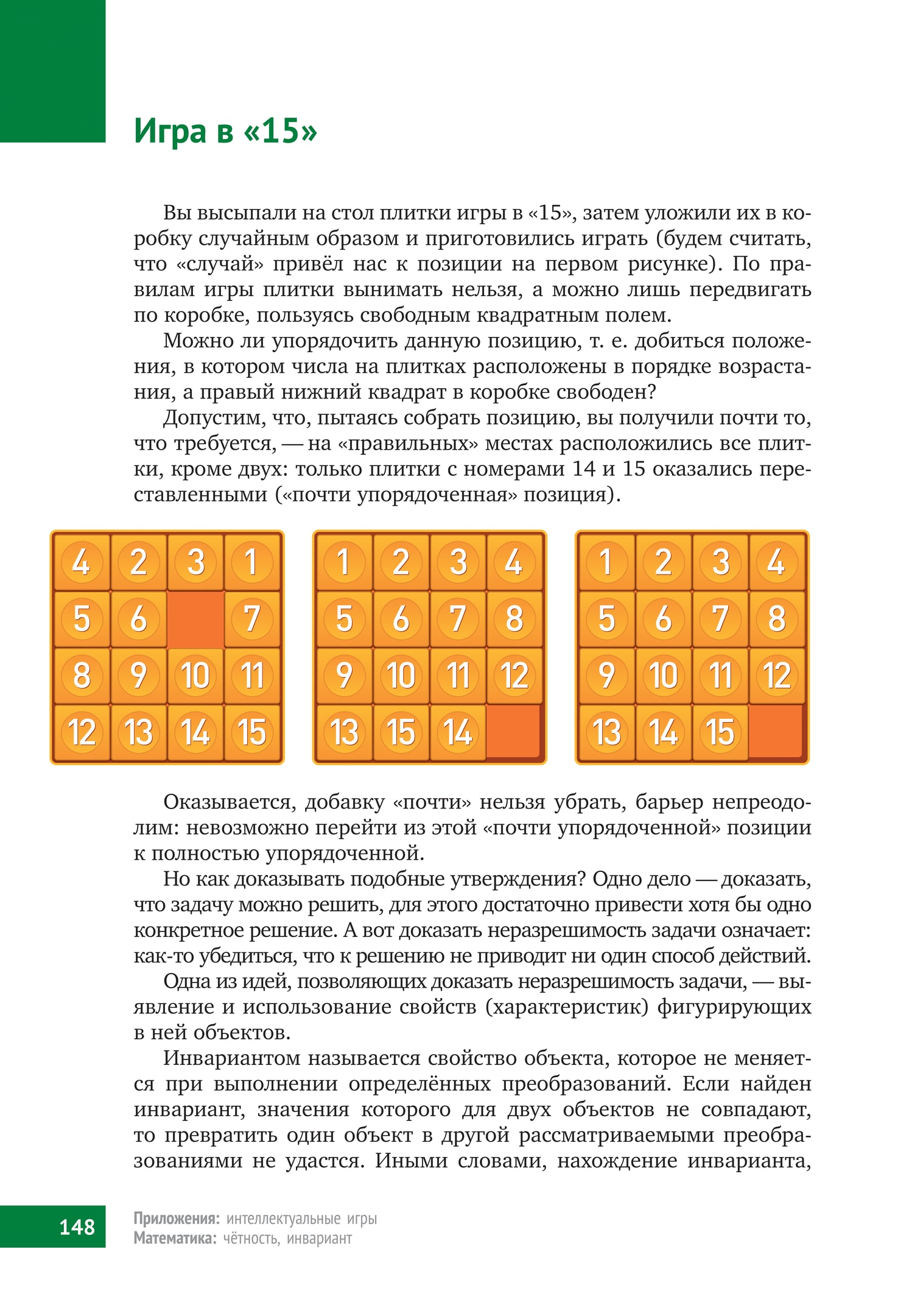 Итак, чётность суммы $A+B$ инвариант. Этот инвариант делит все позиции игры в «$15$» на два непересекающихся семейства — «чётные» и «нечётные». Теперь у нас появился инструмент «предвидения»: если у позиции данный инвариант — нечётный, то эту позицию упорядочить нельзя, даже пытаться не стоит…
