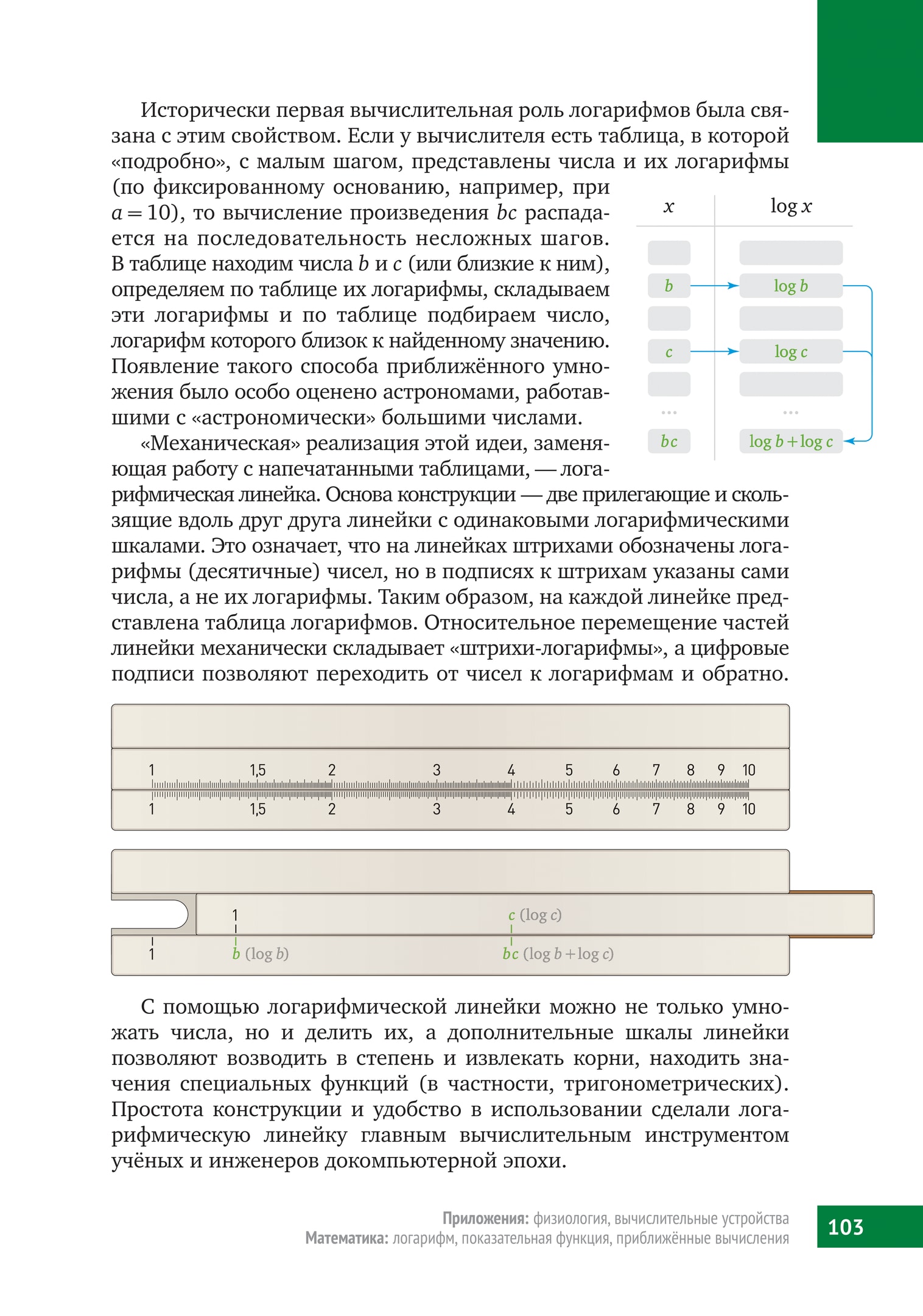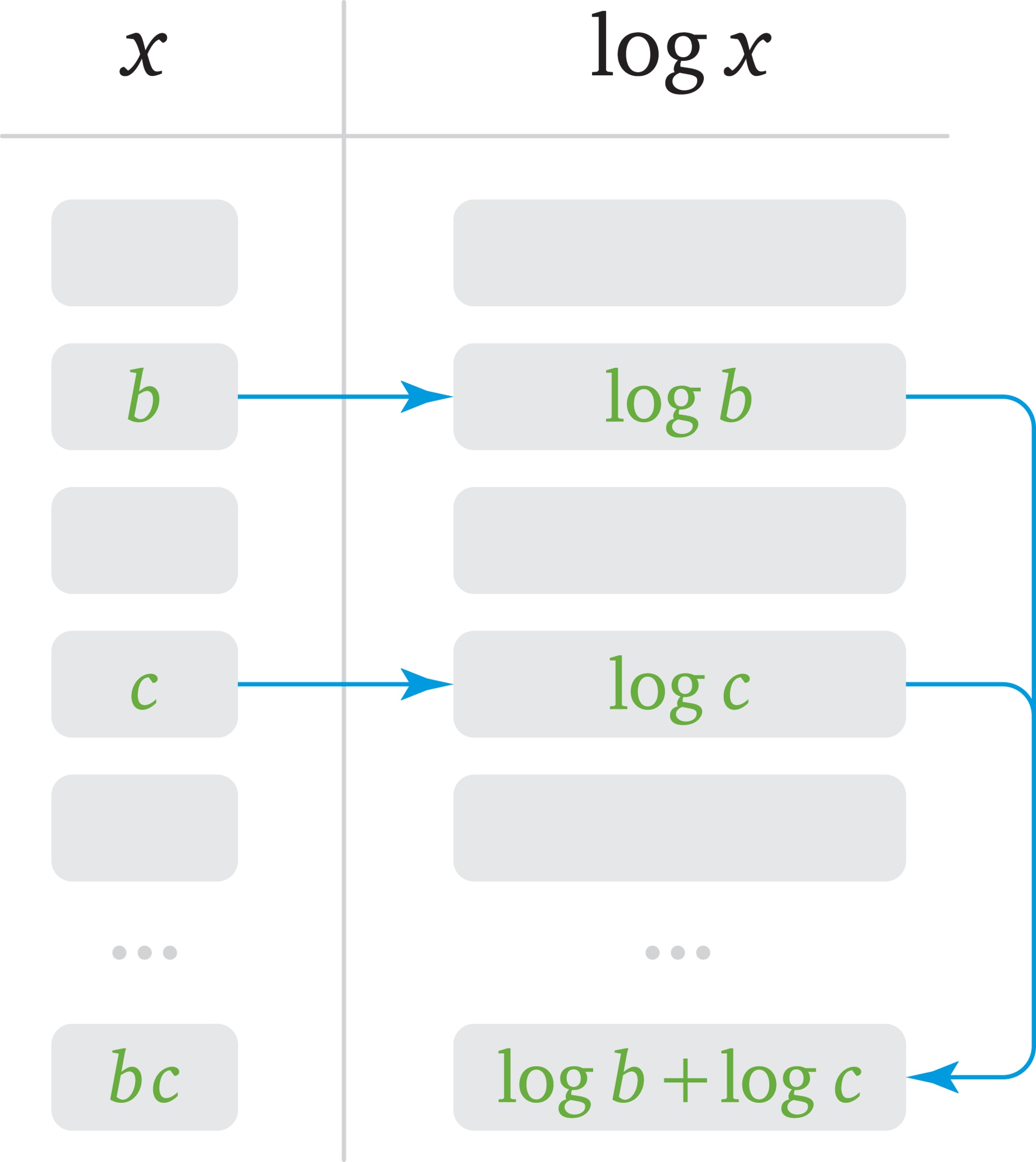 Исторически первая вычислительная роль логарифмов была связана с этим свойством. Если у вычислителя есть таблица, в которой «подробно», с малым шагом, представлены числа и их логарифмы (по фиксированному основанию, например, при $a=10$), то вычисление произведения $bc$ распадается на последовательность несложных шагов. В таблице находим числа $b$ и $c$ (или близкие к ним), определяем по таблице их логарифмы, складываем эти логарифмы и по таблице подбираем число, логарифм которого близок к найденному значению. Появление такого способа приближённого умножения было особо оценено астрономами, работавшими с «астрономически» большими числами.